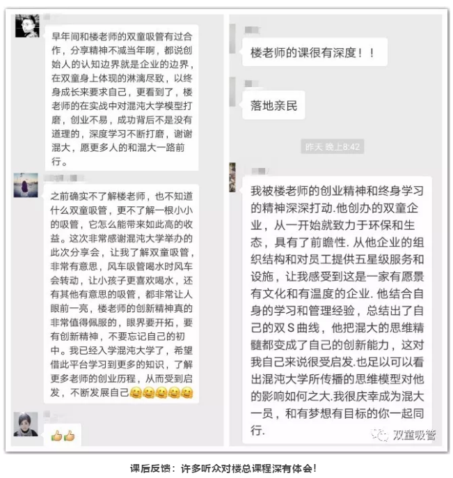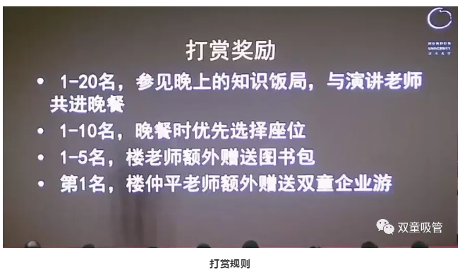 不知不覺分享也到了尾聲,在場聽眾卻依舊意猶未盡,空前的學(xué)習(xí)氛圍,讓每一個(gè)人都沉浸在這場思維的盛宴中!在樓仲平分享之后,同學(xué)們開啟了瘋狂打賞模式,想與樓總有進(jìn)一步交流。晚上的知識(shí)飯局,樓仲平則成了“香餑餑”,成為了大家爭先交流的對(duì)象。