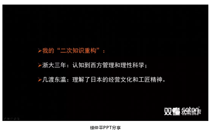 首先,樓仲平在完成原始知識(shí)積累后,1998年在浙大學(xué)習(xí)期間進(jìn)行了第二次知識(shí)重構(gòu),積累了不少管理理念和商業(yè)知識(shí)。在“二次知識(shí)重構(gòu)”期間,他逐漸意識(shí)到自己需要脫離原來圈子,努力向知識(shí)界和學(xué)術(shù)界靠攏,從而獲得經(jīng)驗(yàn)之外的知識(shí),看到感官之外的原理和邏輯。