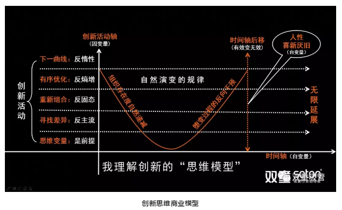 在“創(chuàng)新思維商業(yè)模型”中,X軸是時(shí)間軸,屬于自變量。Y軸是創(chuàng)新深度軸,屬于因變量。創(chuàng)新是對(duì)大自然宇宙演化中一種自然規(guī)律的干預(yù),而這種自然規(guī)律的本質(zhì)是組織存在“自然遞減”的墮變過程,要想改變自然規(guī)律,就必然進(jìn)行不斷地調(diào)整和干預(yù),從而讓組織從“下墮”走向“上揚(yáng)”,否則將會(huì)一直處于遞減的狀態(tài)……