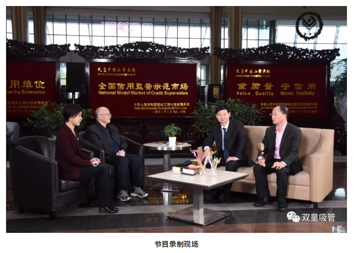 12月6日,金華電視臺改革開放40周年專題節(jié)目“騰飛”篇章在義烏國際商貿(mào)城四區(qū)錄制?!半p童”樓仲平受邀與主持人賀爭怡、浙江師范大學(xué)經(jīng)濟與管理學(xué)院院長陸立軍教授、浪莎集團總裁翁榮弟先生同臺親密互動。