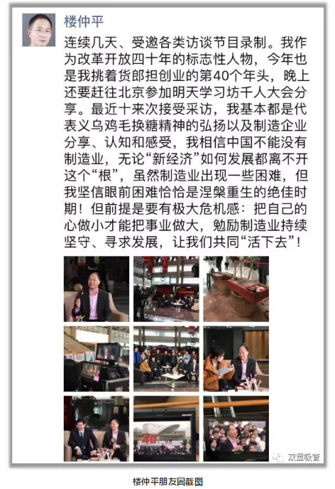 節(jié)目錄制結(jié)束之后,樓仲平也在朋友圈感言:連續(xù)幾天、受邀“改革開放40周年”訪談節(jié)目,我基本都是代表義烏雞毛換糖精神的弘揚以及制造企業(yè)分享、認知和感受,我相信中國不能沒有制造業(yè),無論“新經(jīng)濟”如何發(fā)展都離不開這個“根”,雖然制造業(yè)出現(xiàn)一些困難,但我堅信眼前困難恰恰是涅槃重生的絕佳時期!但前提是要有極大危機感:把自己的心做小才能把事業(yè)做大,勉勵制造業(yè)持續(xù)堅守、尋求發(fā)展,讓我們共同“活下去”!