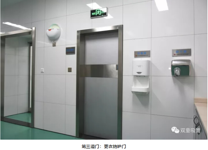 3.經(jīng)過了兩道防護門后,員工們更衣后通過更衣防護門進入洗手消毒區(qū)域。