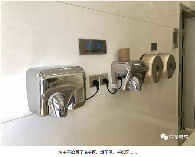 “雙童”每個洗手間的格局分明,除了男女衛(wèi)生間外,還設(shè)置了殘疾人洗手間。洗手區(qū)、烘干區(qū)、手紙區(qū),各個區(qū)域的配置十分齊全。進(jìn)入衛(wèi)生間前,員工可以在手紙區(qū)取紙巾。洗手后,還可以用烘干機(jī)把手烘干。