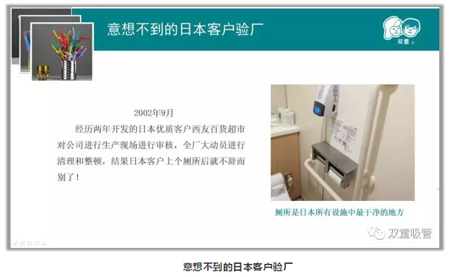 終于,日本客戶到了,樓仲平在辦公室里等了許久卻被告知:日本客戶上個廁所后就不辭而別了!事后公司才了解到,原來,日本人最注重的就是廁所衛(wèi)生,而當(dāng)時“雙童”是租用的廠房廁所,硬件條件有限,他們認(rèn)為一個連廁所都不干凈的企業(yè)做不出高品質(zhì)的產(chǎn)品!