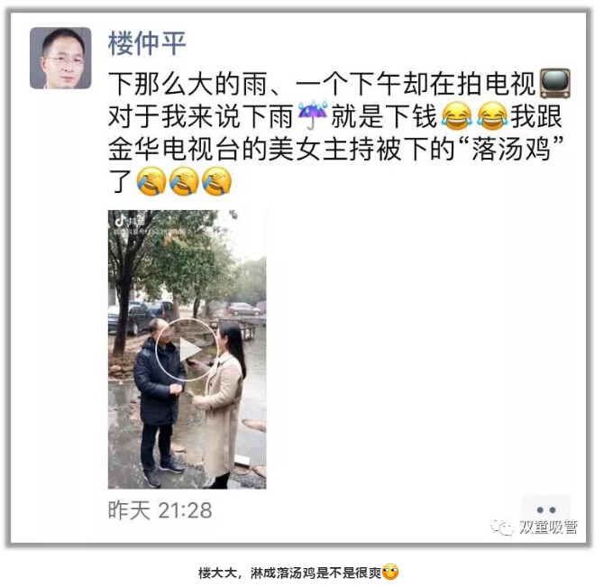 當(dāng)家人樓仲平也在朋友圈感慨,這么多次接受媒體采訪淋著雨還是第一次!哈哈!樓大大,淋成落湯雞的感覺爽不爽呀!