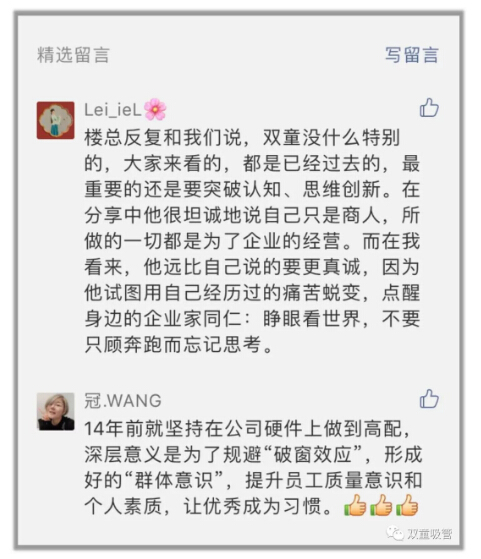 我和樓總其實(shí)之前就認(rèn)識(shí),2017年我?guī)е懈邔觼磉^,但是今天來,感覺變化很大、企業(yè)文化建設(shè)很完善。您剛才提到2016、2017年企業(yè)的陣痛我之前沒想到,我們公司也是近兩年進(jìn)入快速發(fā)展期,人才跟不上。原來想踩剎車、慢一點(diǎn),現(xiàn)在我更堅(jiān)定要跑快一點(diǎn)。今年,我決定我們整個(gè)公司就定下來要學(xué)習(xí)“雙童”。