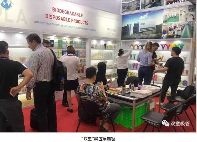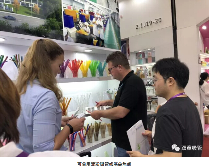 瞧!“雙童”展區(qū)展示著各式各樣的可食用淀粉吸管,它們成為了此次展會(huì)的焦點(diǎn),大批新老客商駐足詢價(jià),現(xiàn)場(chǎng)真是擠爆啦!