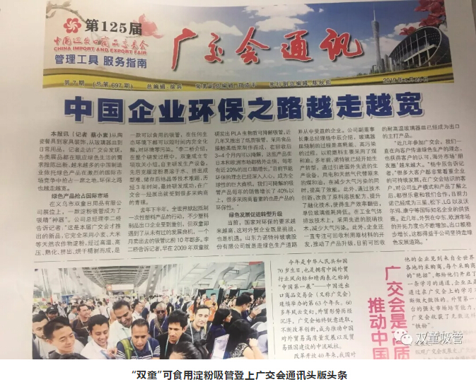 “雙童”可食用淀粉吸管除了吸引了大批客商之外,也引起了媒體朋友們的關(guān)注?!半p童”可食用淀粉吸管作為中國(guó)企業(yè)環(huán)保案例登上了廣交會(huì)通訊報(bào)的頭版頭條,在廣交會(huì)上一炮打響!