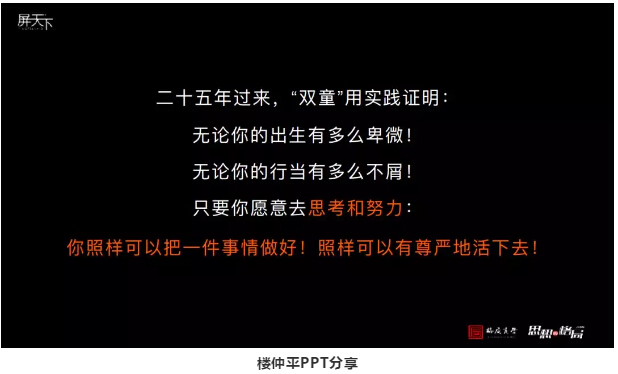 因此,樓仲平引導(dǎo)企業(yè)主們:如果你的企業(yè)還很小、很卑微,一定不要對(duì)自己失去信心,要理解商業(yè)的積累。無論你的行業(yè)有多小,只要你意愿思考和努力,努力代表認(rèn)真,但前提在于思考。從各個(gè)角度去思考,認(rèn)真的去履行,是可以改變命運(yùn)的,改變?nèi)魏嗡^“不好”的產(chǎn)業(yè),所謂的“不好”并不存在?!白鍪裁础辈⒉恢匾?,重要的是“怎么做”!