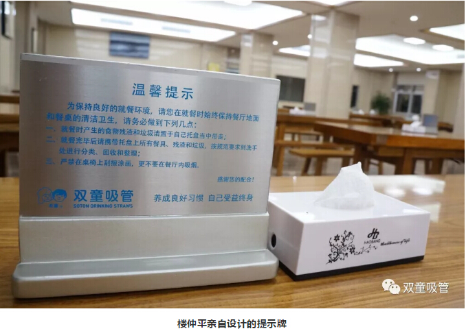 食堂餐桌上,擺放著樓仲平親自設(shè)計的提示牌,標注的文字并不“可愛”:用餐者把食物殘渣放置在托盤中;用餐完畢后,在洗手處把碗具和餐后垃圾分類投放;嚴禁在桌椅上涂鴉。