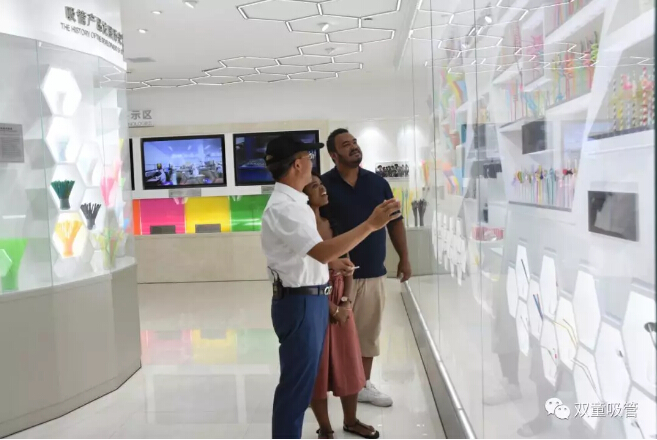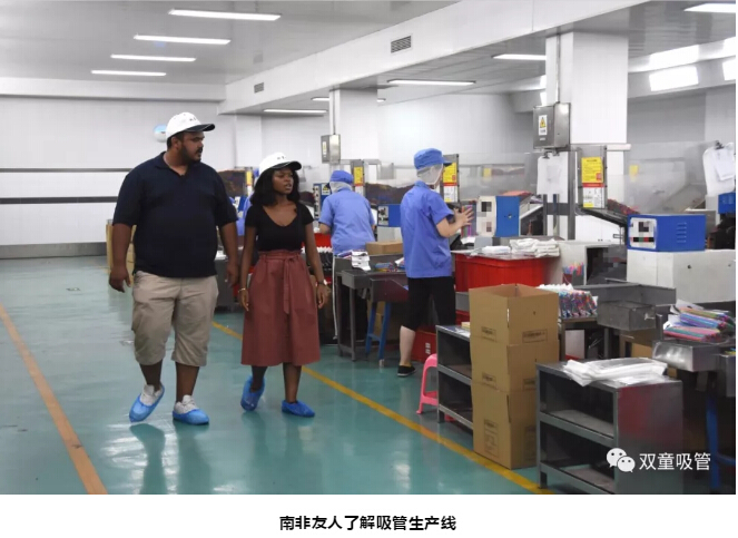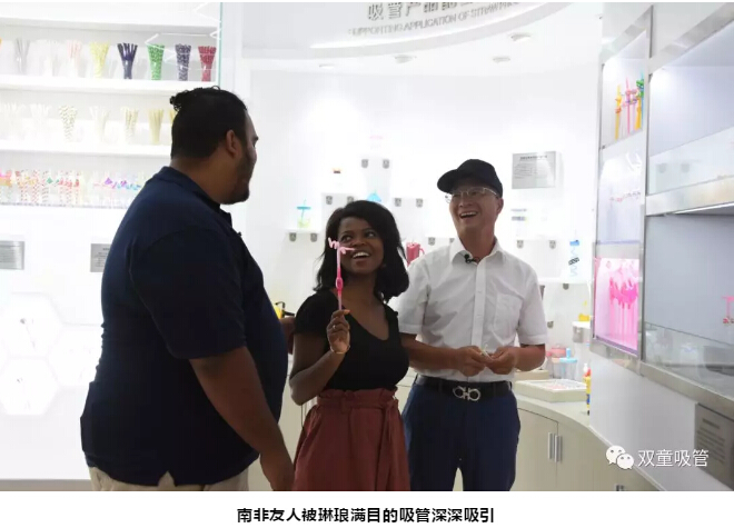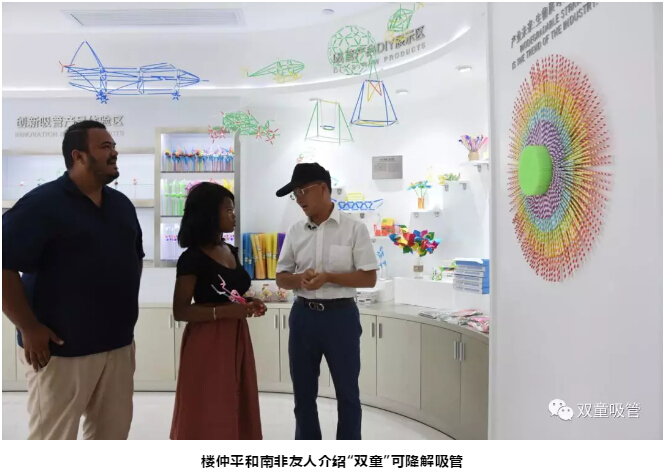 接著,南非友人被“雙童”可降解吸管吸引住了,在聽了樓仲平對“雙童”PLA生物質(zhì)可降解吸管、“雙童”紙質(zhì)吸管等一番介紹后,他們覺得十分不可思議,一根吸管不僅可以玩出這么多花樣,還可以做得如此環(huán)保!