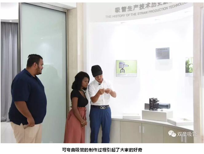 在參觀過程中,樓仲平也向南非友人介紹了早期可彎吸管的制作過程:吸管通過成型機(jī)器壓出折彎波紋后,工人們再用一根筷子將吸管擠壓出彎節(jié),形成可彎吸管。南非友人在看完演示后恍然大悟,表示他們從沒想過原來早期吸管是這樣巧妙地做成的!
