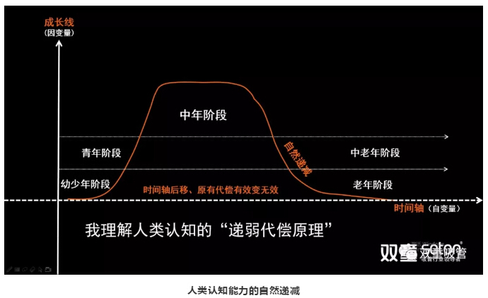 這個(gè)過(guò)程當(dāng)中,我用一個(gè)“認(rèn)知能力”思維模型給大家說(shuō)明:人類(lèi)發(fā)展中的成長(zhǎng)性是能夠無(wú)窮拓展的。比如正常來(lái)講,看一個(gè)人的認(rèn)知能力,從幼年、少年、青年,到中年處于一個(gè)鼎盛階段,到中老年階段之后就進(jìn)入到自然遞減的過(guò)程。這是一個(gè)自然規(guī)律,這個(gè)規(guī)律不是人類(lèi)的自然規(guī)律,而是宇宙萬(wàn)物的規(guī)律。