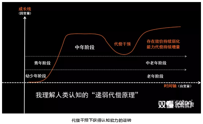 那有沒(méi)有辦法改變呢?我們可以通過(guò)持續(xù)不斷學(xué)習(xí),開(kāi)放、交流,來(lái)獲得外部世界的信息,作為我們的代償能力干預(yù),從而逆轉(zhuǎn)自然規(guī)律下的認(rèn)知能力遞減,從而實(shí)現(xiàn)對(duì)認(rèn)知能力自然規(guī)律的反向干預(yù)。