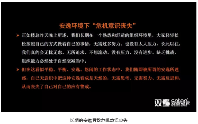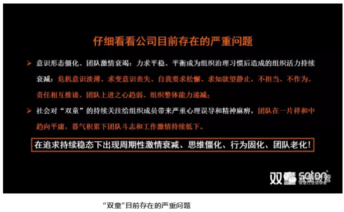 意識形態(tài)僵化、團隊激情衰竭:力求平穩(wěn)、平衡成為組織治理習慣后造成的組織活力持續(xù)衰減; 危機意識淡薄、求變意識喪失、自我要求松懈、求知欲望靜止,不擔當、不作為、責任相互推諉、團隊上進之心趨弱、組織整體能力遞減; 社會對“雙童”的持續(xù)關注給組織成員帶來嚴重心理誤導和精神麻痹,團隊在一片祥和中趨向平庸,暮氣積累下團隊斗志和工作激情持續(xù)低下。