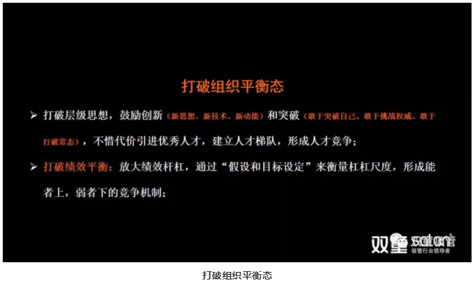 打破層級思想,鼓勵創(chuàng)新(新思想、新技術、新動能)和突破(敢于突破自己、敢于挑戰(zhàn)權威、敢于打破常態(tài)),不惜代價引進優(yōu)秀人才,建立人才梯隊,形成人才競爭; 打破績效平衡:放大績效桿杠,通過“假設和目標設定”來衡量杠杠尺度,形成能者上,弱者下的競爭機制;