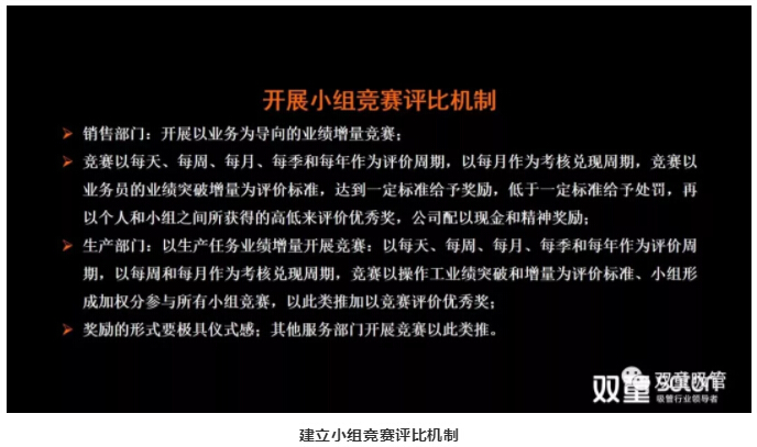 銷售部門:以業(yè)務為導向的業(yè)績增量競賽;競賽以每天、每周、每月、每季和每年作為評價周期,以每月作為考核兌現(xiàn)周期,競賽以業(yè)務員的業(yè)績突破增量為評價標準,達到一定標準給予獎勵,低于一定標準給予處罰,再以個人和小組之間所獲得的高低來評價優(yōu)秀獎,公司配以現(xiàn)金和精神獎勵; 生產(chǎn)部門:以生產(chǎn)任務業(yè)績增量開展競賽;以每天、每周、每月、每季和每年作為評價周期,以每周和每月作為考核兌現(xiàn)周期,競賽以操作工業(yè)績突破和增量為評價標準、小組形成加權分參與所有小組競賽,以此類推加以競賽評價優(yōu)秀獎;獎勵的形式要極具儀式感;其他服務部門開展競賽以此類推。