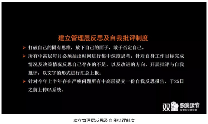打破自己的固有思維,放下自己的面子,敢于否定自己。 所有中高層每月必須抽出時間進行集中深度思考,針對自身工作目標完成情況及決策情況反思自己存在的不足,以及改進的方向,開展批評與自我批評,以文字的形式進行匯總上報; 針對今年上半年存在嚴峻問題所有中高層提交一份自我反思報告,于25日之前上傳OA系統(tǒng)。