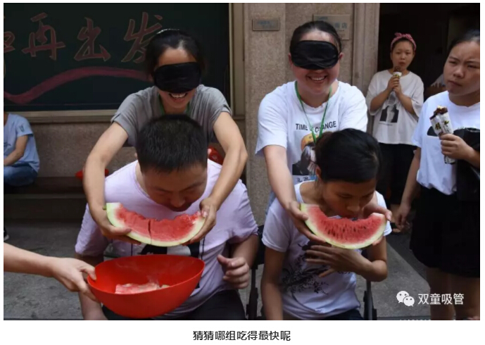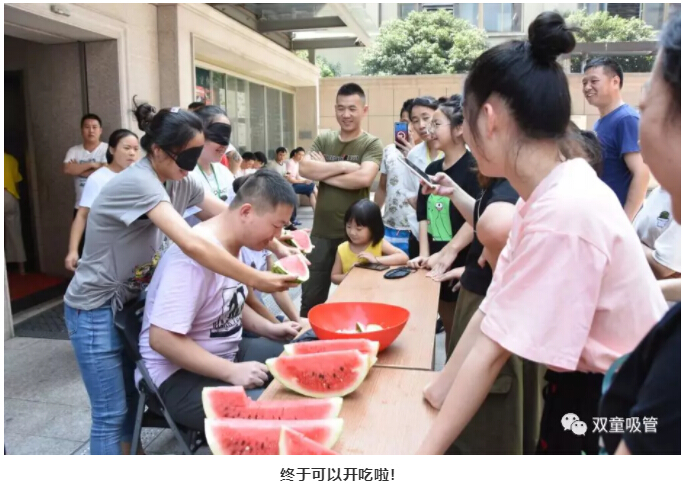 游戲的第一項(xiàng)就是“蒙眼吃西瓜”!聽到吃,大家的眼睛都亮了,笑說(shuō):吃西瓜,太簡(jiǎn)單了!真的像大家說(shuō)的很簡(jiǎn)單嗎?快跟著妞來(lái)看看吧!