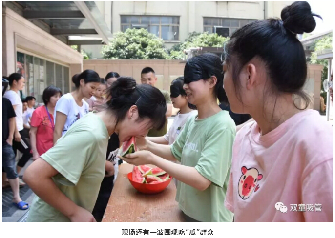 兩人一組,一個(gè)蒙眼喂西瓜,一個(gè)吃西瓜,聽起來(lái)十分簡(jiǎn)單,但也看雙方的配合是否默契?,F(xiàn)場(chǎng)相互比拼的緊張氣氛,看得所有人都倒吸一口氣!不過,這位童鞋可真賣力!