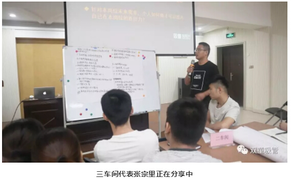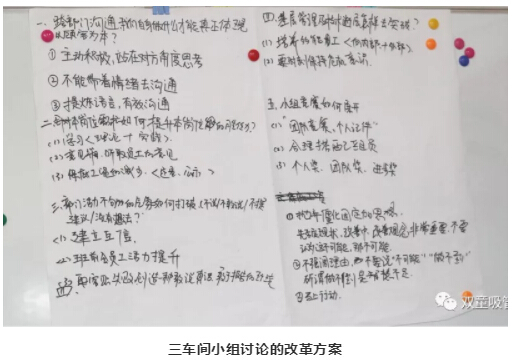 緊接著,針對如何落實車間競賽,三車間也派代表分享了小組討論的改革方案:通過“團隊比賽,個人計件”的形式,在這個過程中,對老員工、新員工進行合理的搭配,并在后續(xù)根據(jù)所有員工自身產(chǎn)生的產(chǎn)量,設(shè)立“個人獎”、“團隊獎”、“進步獎”,并給與獎勵,促使每位員工積極參與。