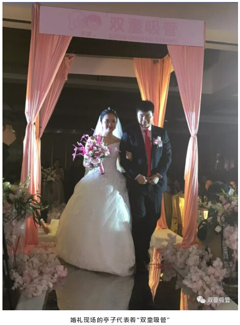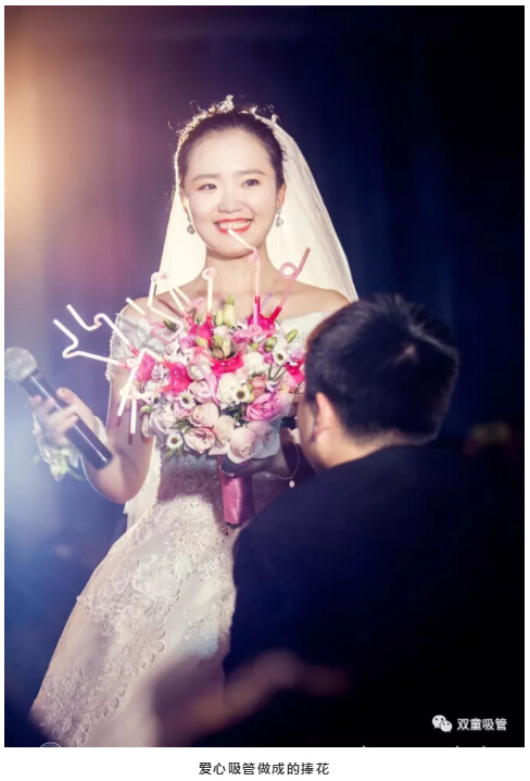 婚禮現(xiàn)場(chǎng)也是滿滿的“雙童”元素。婚禮現(xiàn)場(chǎng)的亭子就代表著“雙童吸管”,吸管妞手里的捧花,也是由一根根愛心吸管組成的,洋溢著滿滿的愛意!