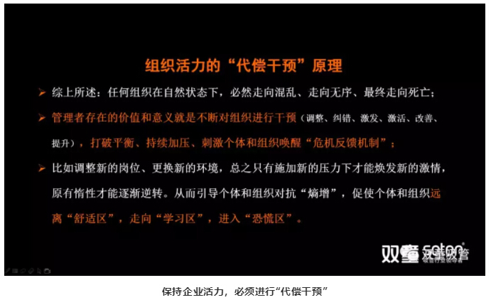 緊接著,樓仲平將熱力學(xué)第二定律的“熵增定律”引入到企業(yè)經(jīng)營當(dāng)中,引導(dǎo)大家更深入理解:在一個(gè)長期熟悉和舒適組織環(huán)境里大家都能輕松地做著自己在行的事情,無需過多努力就能完成任務(wù)。長此以往,組織能力必然處于自然衰減當(dāng)中,這是一種自然規(guī)律。