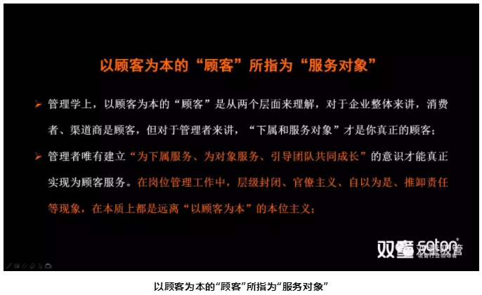 第一個(gè)概念,“雙童”提出了建立“以顧客為本”的時(shí)代價(jià)值觀。管理學(xué)上的“以顧客為本”要從兩個(gè)層面來理解:第一個(gè)層面是企業(yè)對(duì)外的顧客,也就是常規(guī)的消費(fèi)者、渠道商;第二個(gè)層面,對(duì)于管理者來講,“下屬和服務(wù)對(duì)象”才是真正的顧客,一線員工才是真正的顧客。提出這一概念的根本目的,是為了打破“雙童”管理者現(xiàn)有的層級(jí)思想,徹底剝離管理層僅有的權(quán)利!