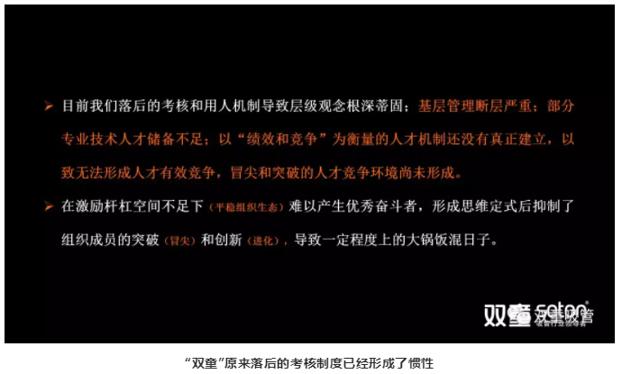 第二個(gè)概念,“雙童”提出建立以“奮斗者為本”的時(shí)代價(jià)值觀?!半p童”原來落后的考核制度已經(jīng)形成了慣性,從而導(dǎo)致基層管理斷層,部分專業(yè)技術(shù)人員儲(chǔ)備不足。