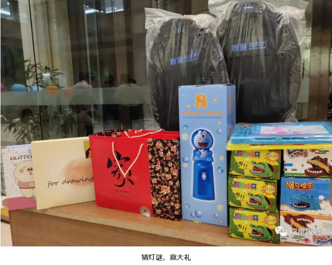 活動正式開始!員工們早就躍躍欲試?yán)?!大家紛紛來到燈籠旁仔細(xì)閱讀燈籠下掛著的燈謎,得出答案后到領(lǐng)獎區(qū)校對答案,猜對燈謎的員工們即可獲得抽獎機(jī)會一次,禮盒月餅、“雙童”定制背包、桌面飲水機(jī)……各類禮品也讓員工們喜笑顏開!