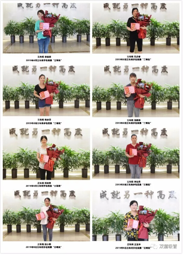2019年8月三車間手包競(jìng)賽一等獎(jiǎng):李梅二等獎(jiǎng):楊蓮英、孔慶香、楊永芬、劉晴晴三等獎(jiǎng):何啟貴、李伍秀、田小燕、王玉華、徐善君