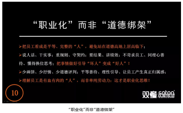 在“雙童”,所謂“忠誠(chéng)”并不是要求員工單方面向企業(yè)效忠,而是企業(yè)和員工之間相互忠誠(chéng),相互理解。