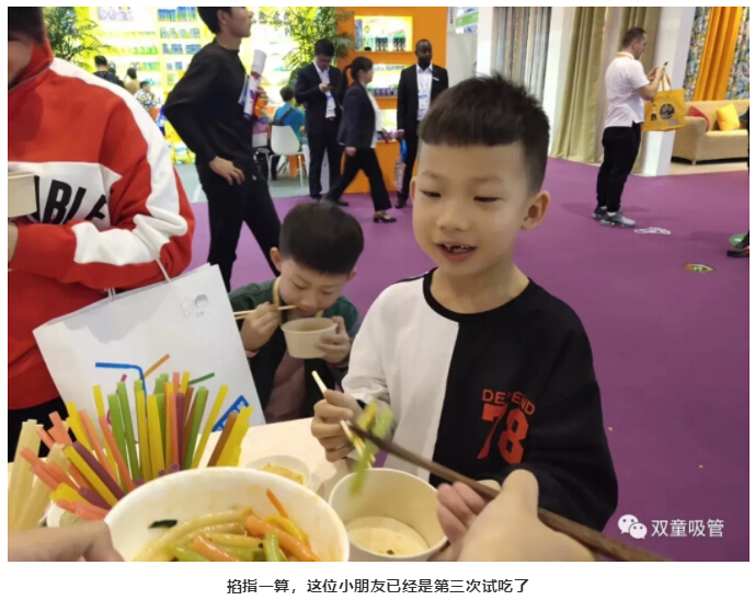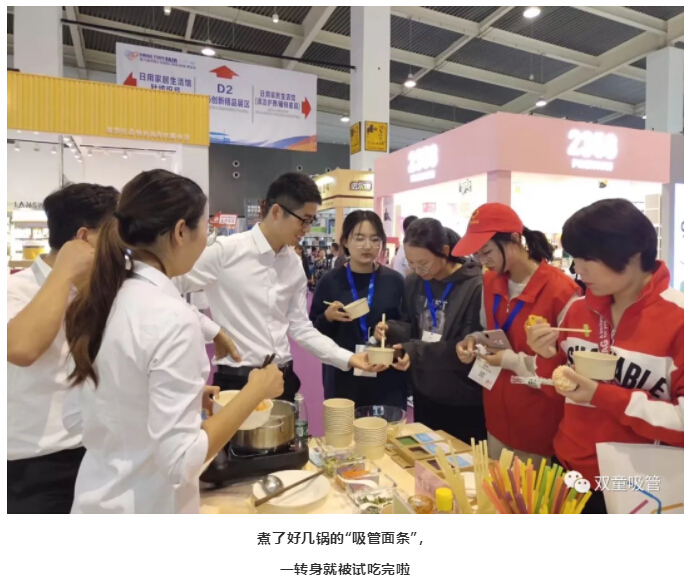 與以往不同的是,今年的“雙童”展區(qū)展示著眾多可食用淀粉吸管,并且在義博會現(xiàn)場,吸管妹妹們還煮起了“吸管面條”,供大家免費試吃,這可讓“雙童”展區(qū)前擠滿了人!