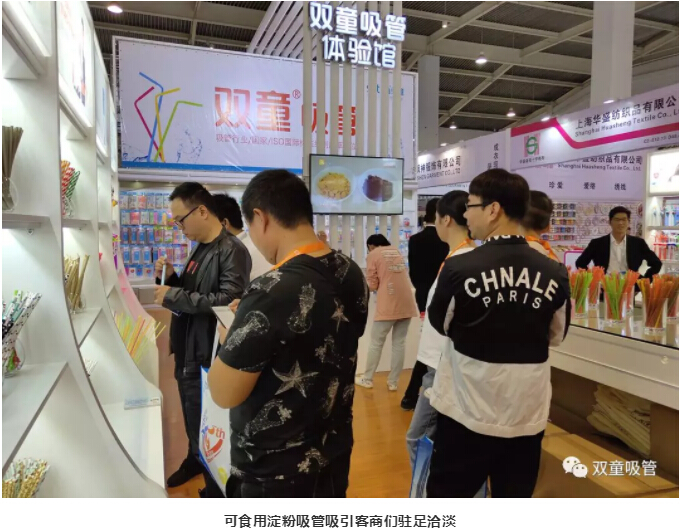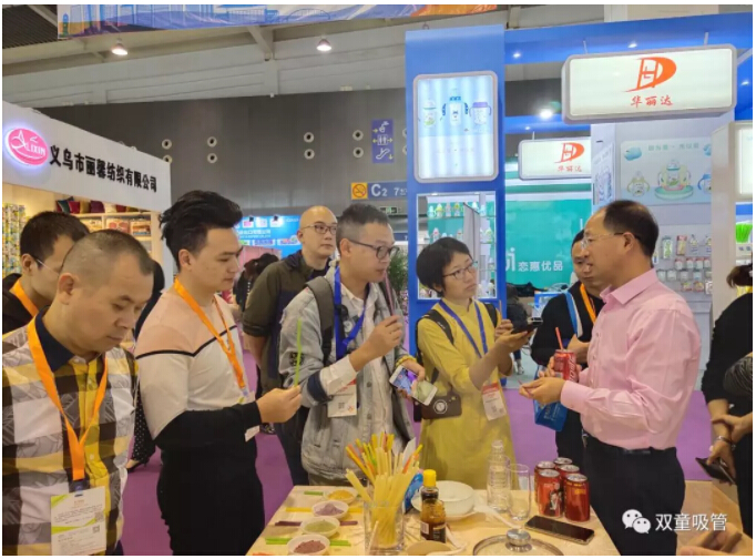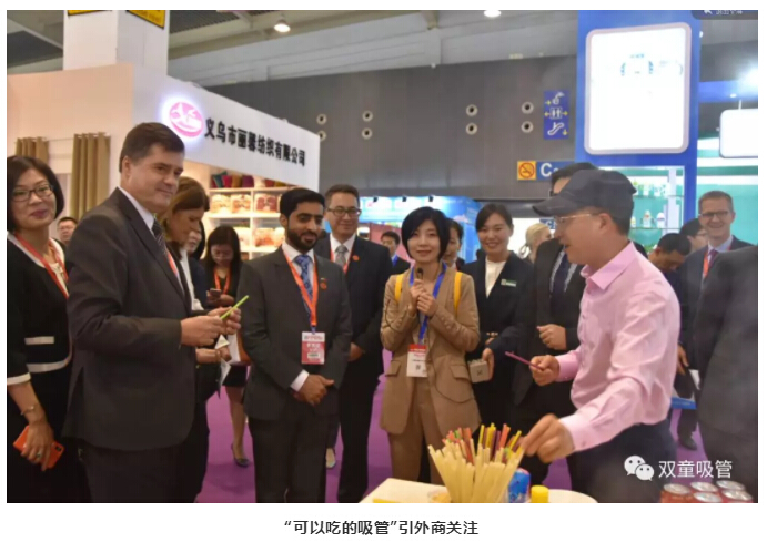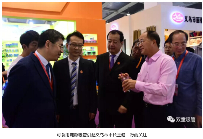 在義博會上,“雙童”可食用淀粉吸管成為了展會“大明星”,不僅引起了義烏市市長王健一行和外商客人的關注,而且也吸引了大批新老客戶駐足洽談。