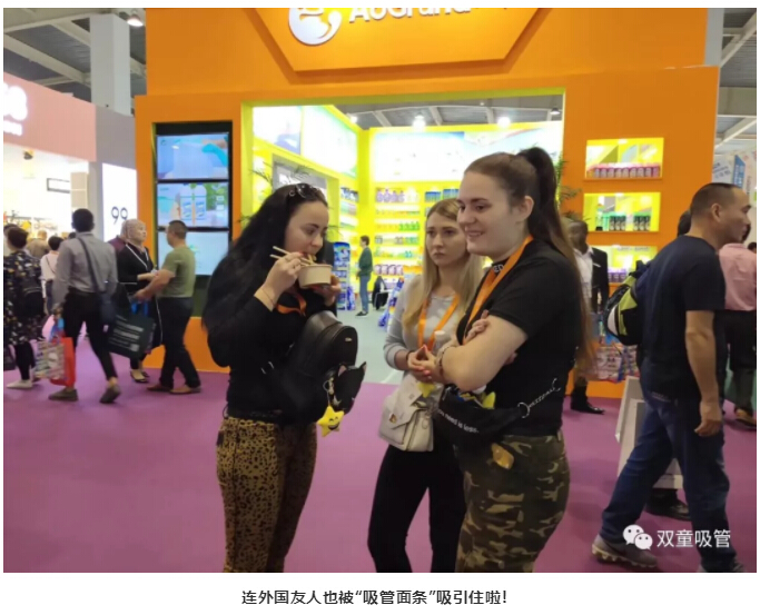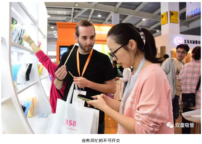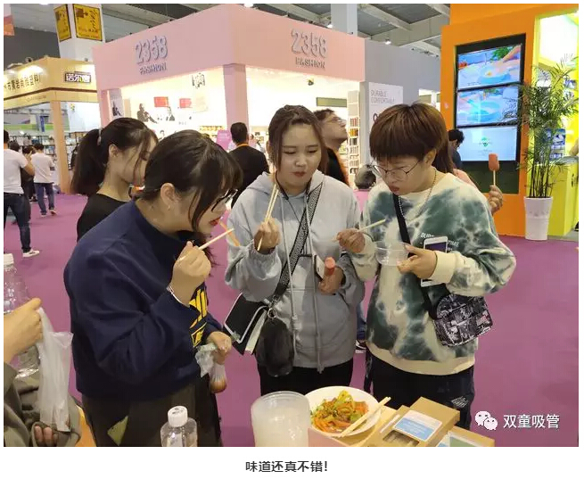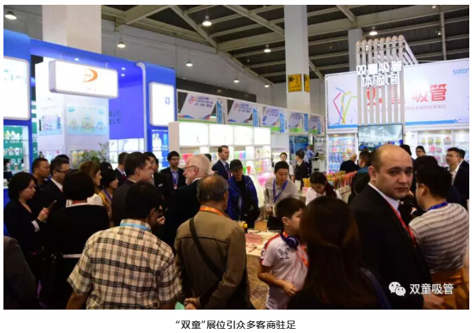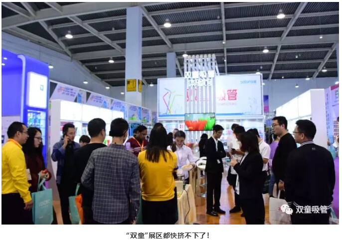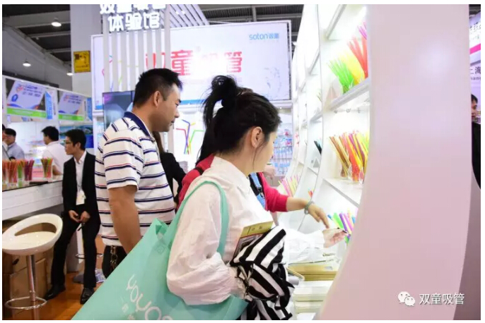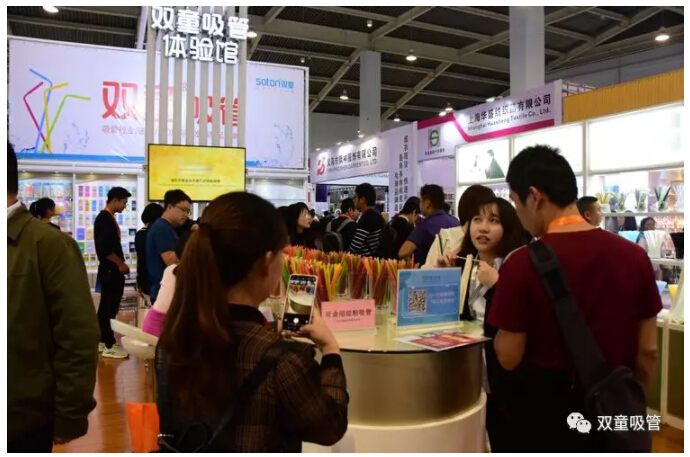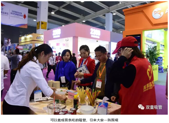 “雙童”可食用淀粉吸管在義博會上閃亮登場,成為了展會上的“大明星”,一瞬間就勾起了來往客商滿滿的好奇心,紛紛駐足洽談,“雙童”展位都快擠“爆”了!