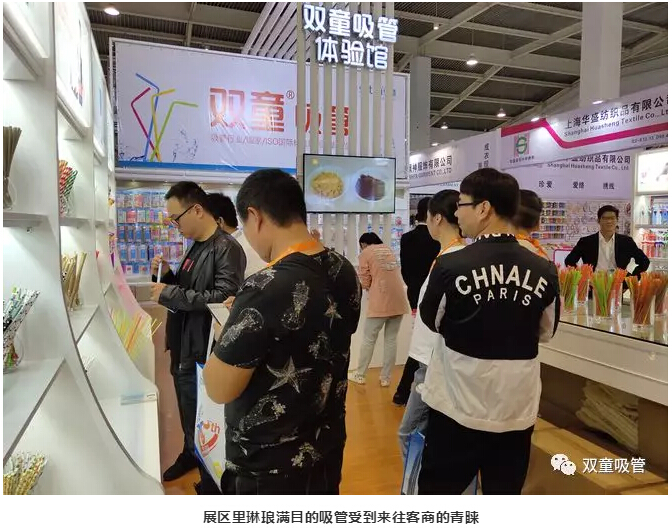 聽過“雙童”樓仲平的詳細(xì)解釋后,不僅采訪記者們紛紛點(diǎn)贊,而且來往客商們也表示:這款吸管是用淀粉做的,是環(huán)保的,真的不錯!