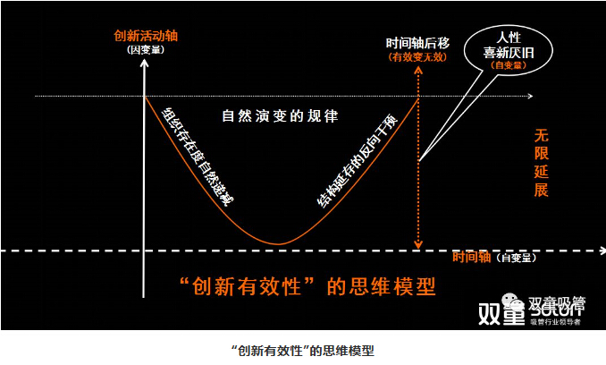 由此可以推導(dǎo)出,創(chuàng)新是創(chuàng)業(yè)活動(dòng)的前提,是不得不為之的“生存干預(yù)”。在這個(gè)干預(yù)過程當(dāng)中大家要理解,它某種程度上是滿足人性的底層,它有一個(gè)不變的規(guī)律就是在時(shí)間軸后移的情況下創(chuàng)新有效變無效,所以創(chuàng)新是一個(gè)無限延展的過程。