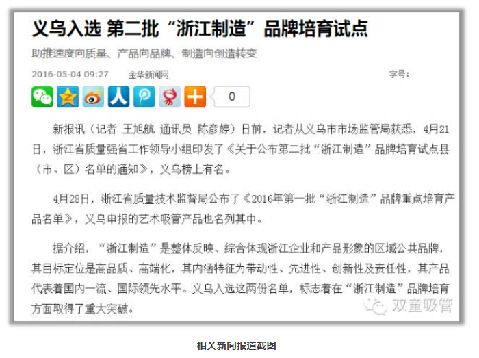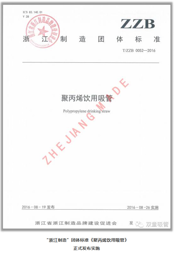 雙童成為義烏首家“浙江制造”標(biāo)準(zhǔn)企業(yè) 首先,讓我們來回顧一下“雙童”成為義烏首家制訂“浙江制造”標(biāo)準(zhǔn)企業(yè)的過程: 2016年年初,經(jīng)浙江省質(zhì)量技術(shù)監(jiān)督局、浙江省標(biāo)準(zhǔn)化研究院等相關(guān)領(lǐng)導(dǎo)專家團(tuán)隊(duì)多次論證,認(rèn)為“聚丙烯飲用吸管”符合“浙江制造”定位要求,推動(dòng)聚丙烯飲用吸管品牌認(rèn)證具有重大意義,決定將“聚丙烯飲用吸管”列入2016年“浙江制造”品牌認(rèn)證目錄,并由“雙童”主導(dǎo)制訂“浙江制造”《聚丙烯飲用吸管》標(biāo)準(zhǔn)。