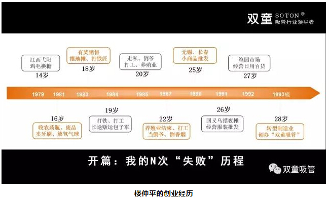 在視頻中,樓仲平生動(dòng)的講述了他對于創(chuàng)業(yè)的理解和對吸管行業(yè)的堅(jiān)守。實(shí)際上,樓仲平在初中時(shí)期就因?yàn)榧彝ヘ毨ЦS父親到江西雞毛換糖,四處漂泊,在尋找安身立命之處時(shí),同時(shí)也在外面發(fā)現(xiàn)了更為宏大的世界。在這個(gè)過程中,唯一不變的就是他對美好生活始終充滿了向往!下面,吸管妞帶大家回顧一下樓仲平的創(chuàng)業(yè)歷程:https://v.qq.com/x/page/p3014iuf3mf.html