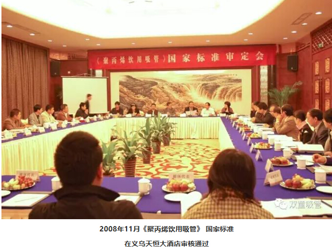 其實,在標(biāo)準(zhǔn)編制起草過程中,“雙童”也曾邀請一些同行企業(yè)共同參與,但由于當(dāng)時大家的標(biāo)準(zhǔn)意識還比較薄弱,再加上標(biāo)準(zhǔn)編制過程中還需要企業(yè)承擔(dān)一定費用,這讓其他企業(yè)都望而卻步,“雙童”自然地成為了吸管行業(yè)承制國家標(biāo)準(zhǔn)的單一企業(yè)。2008年11月,《聚丙烯飲用吸管》 國家標(biāo)準(zhǔn)審定會在義烏天恒大酒店召開。會上審核通過了該項國家標(biāo)準(zhǔn),成為當(dāng)時金華地區(qū)第一件完全意義上的國家標(biāo)準(zhǔn)。