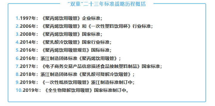 正是因為“雙童”持續(xù)主導(dǎo)吸管行業(yè)標(biāo)準(zhǔn)的制定,使得“雙童”始終站在行業(yè)的制高點,直接推動企業(yè)的品質(zhì)管理體系的建立、改善和提升,直接影響企業(yè)的品牌傳播,并最終獲得吸管產(chǎn)業(yè)的話語權(quán)、規(guī)則權(quán)和定價權(quán),成為全球吸管行業(yè)的領(lǐng)導(dǎo)者!