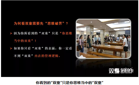 以“雙童”為例,很多人來“雙童”參觀都覺得“雙童”的硬件環(huán)境很好,但是每當(dāng)樓仲平和參觀者分享時,他所做的第一件事就是引導(dǎo)大家進(jìn)行“思維破界”,突破你的眼前所見,去了解和探究“雙童’為什么要這么做,這樣做的底層邏輯在哪里,從而徹底理解“雙童”內(nèi)在的管理邏輯!