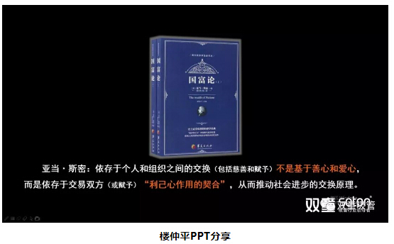 當(dāng)晚,樓仲平將二十年前閱讀,并一直影響他至今的書籍《國富論》(此書被譽為“西方經(jīng)濟學(xué)圣經(jīng)”)也帶到了現(xiàn)場,并直白地告訴大家,正是因為以亞當(dāng)斯密的《國富論》為代表的西方哲學(xué)思想影響,他才能夠理解商業(yè)的底層邏輯,才能夠從另一個維度來認(rèn)知:“雙童”的所作所為,并不是基于善心和愛心,而是基于商業(yè)交換原則下“利己心作用的契合”!