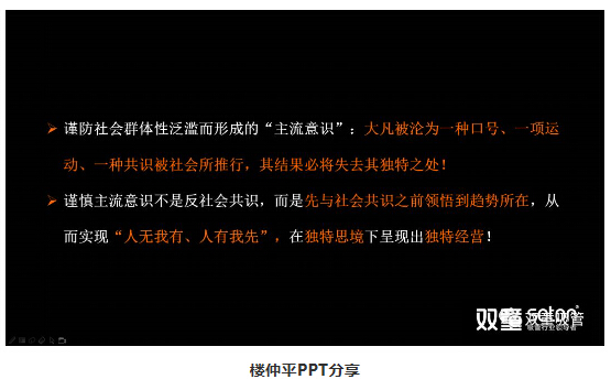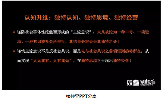 但是,我們一定要理解,謹(jǐn)慎主流意識并不是反社會共識,而是先于社會共識之前領(lǐng)悟到趨勢所在,極早作出改變,從而實現(xiàn)“人無我有、人有我先”,在獨特思境下呈現(xiàn)出獨特經(jīng)營,創(chuàng)造出獨特的價值!