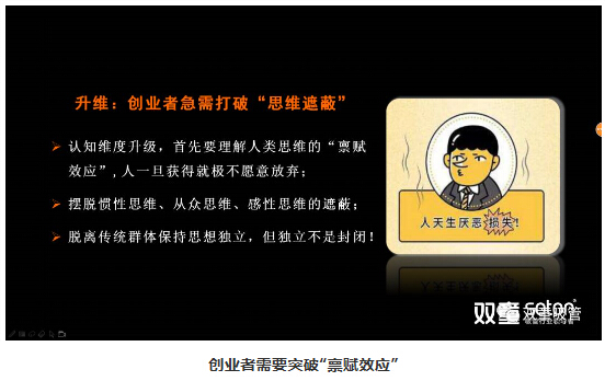 接著,樓仲平通過“稟賦效應(yīng)”的案例講述,讓大家理解到人一旦獲得就不愿意放棄,思想一旦陷入舊的傳統(tǒng)范式中,就極難轉(zhuǎn)換到新的思維范式中去。因此,創(chuàng)業(yè)者需要打破慣性思維、從眾思維、感性思維的“思維遮蔽”,突破“稟賦效應(yīng)”,脫離傳統(tǒng)群體保持思想獨立,從而實現(xiàn)認(rèn)知升維!