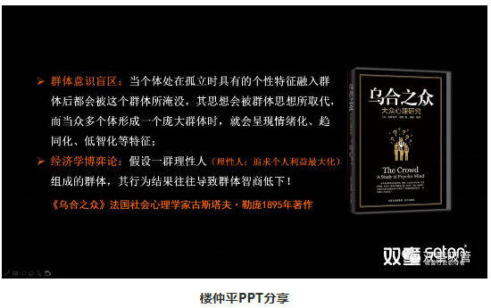 講到這里,樓仲平又向大家推薦了法國社會心理學(xué)家勒龐的著作《烏合之眾》,該書中提到了群體意識盲區(qū):當(dāng)個體處在孤立時具有的個性特征融入群體后都會被這個群體所淹沒,其思想會被群體思想所取代,而當(dāng)眾多個體形成一個龐大群體時,就會呈現(xiàn)情緒化、趨同化、低智化等特征。
