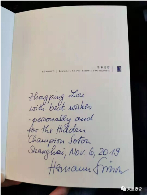 除此之外,西蒙教授還贈(zèng)送了“雙童”樓仲平一本他親筆簽名的《隱形冠軍》書(shū)籍作為紀(jì)念!