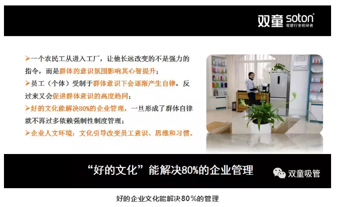 我一直認為,人沒有什么好壞,都是可以改變的,關(guān)鍵是企業(yè)如何賦予。企業(yè)通過對硬件的優(yōu)化配置,營造自律氛圍,在潛移默化中培養(yǎng)員工的精神性,而這些歸根到底就是“文化”二字。