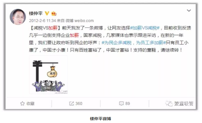 無獨(dú)有偶,其實(shí)早在2012年,樓仲平就發(fā)布了一條關(guān)于“員工加薪”的微博,引起了極大的關(guān)注。微博上寫道:“為民企多減稅,為員工多加薪,只有員工小康了,中國才小康!”樓仲平認(rèn)為,員工是企業(yè)的基礎(chǔ),只有員工穩(wěn)定了,企業(yè)才會(huì)穩(wěn)定,只有員工提升了,企業(yè)才會(huì)更好發(fā)展,對(duì)員工更好了,企業(yè)反而會(huì)獲得更多!